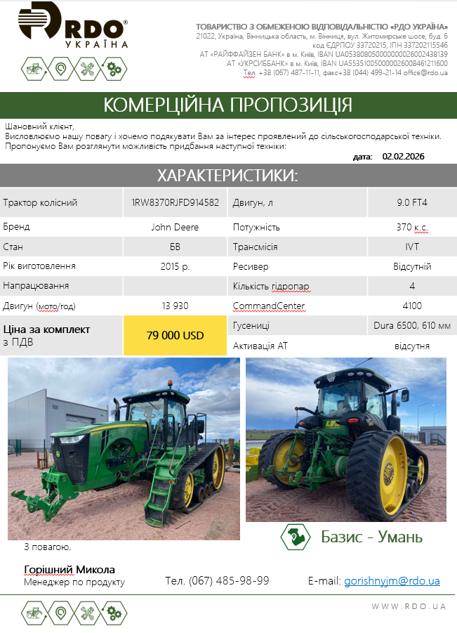 | Потужність трактора, к.с. | 370 |