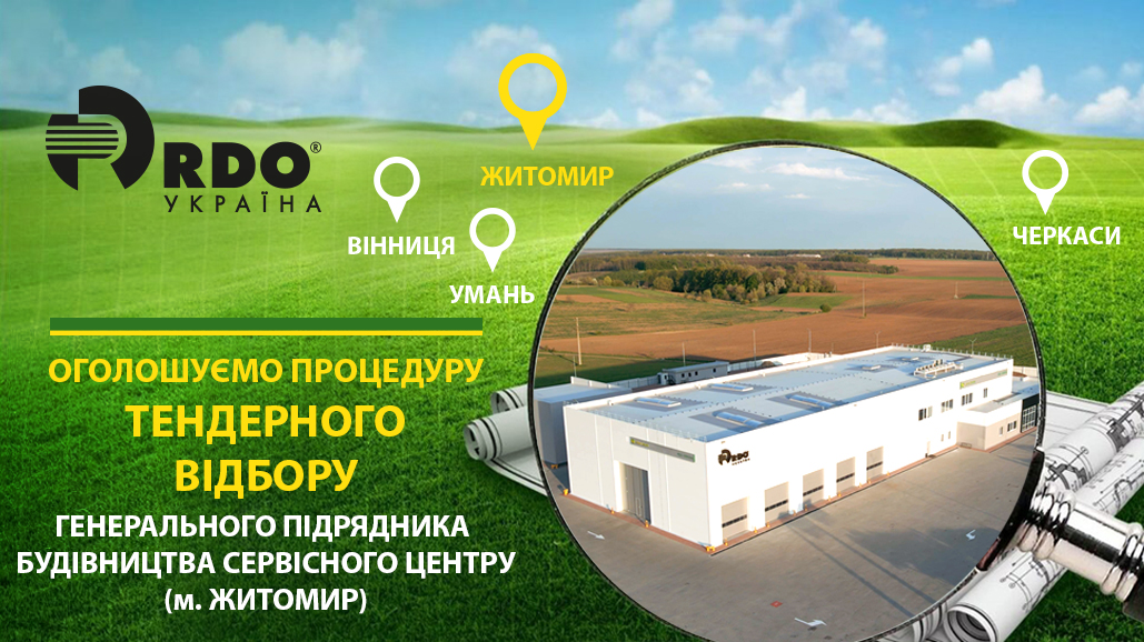 Компанія ТОВ «РДО УКРАЇНА» запрошує будівельні компанії подавати свої пропозиції на участь в етапі прекваліфікації (допуску) до тендерної процедури для отримання контракту по реалізації повного циклу проєктування та будівництва Сервісного центру для демонстрації, продажу та ремонту сільськогосподарської техніки на земельній ділянці за адресою: Житомирська область, Житомирський р-н, с. Станишівка, вул. Шевченка 1-а, кадастровий номер 1822086800:02:002:0564 загальною площею 3,8362 га (площа забудови - 2 га).